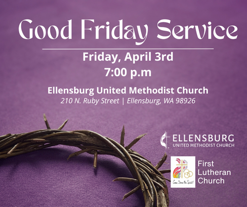 Friday, April 3rd is Good Friday and we will have a special worship service at 7:00pm in our Sanctuary. This will be a joint service with the congregation of Ellensburg First Lutheran Church. The service will have some special music, congregational singing, times of silence, and the reading of the passion story -- that is, the story of Jesus' crucifixion and death. As we acknowledge the pain and grief of Jesus' death, we anticipate his resurrection on Easter. Special music will be shared by Andrew Gomes.