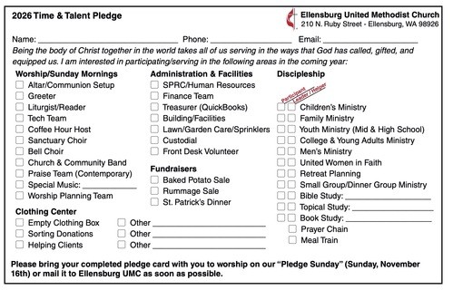 Click the link to the right to download our Time and Talent Pledge Card to share your interest in participating or serving in one of our ministry areas at Ellensburg UMC. Your "Time and Talent" card can be dropped off at the church or mailed to: